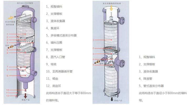 規(guī)整填料塔的分離性能取決于內(nèi)件,即填料、分布器、收集器等。同時也取決于許多參數(shù),如氣體負荷、液體負荷、物料性質(zhì)、操作壓力、填料濕潤性能和液體分布不均勻等等。至今不能由填料的幾何形狀來準確計算塔的分離性能,需要通過填料塔的理論和不同條件下通過試驗塔來測定準確數(shù)據(jù)。用戶可根據(jù)資料以近似程度確定塔的尺寸和需要的填料高度。如果需要經(jīng)濟、合理的結(jié)構(gòu)形式,我廠愿與用戶密切合作。